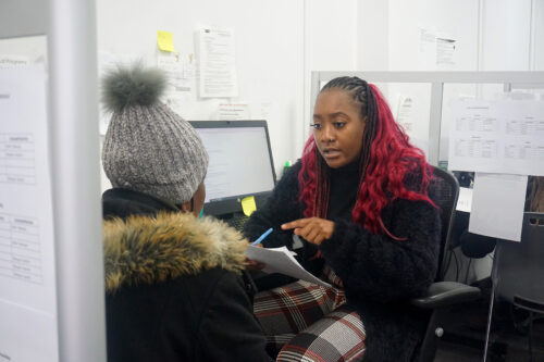 Samiha Meah visits Community Justice Connect in Jamaica, Queens. Volunteers okay with being photographed. Photo releases from the 2 clients noted.